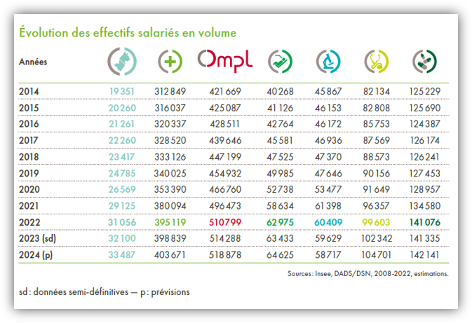 Par rapport à 2014, la branche enregistre une progression (+ 60,5 %) de ses effectifs salariés en 2022. Selon les prévisions réalisées pour les années 2023 et 2024, cette tendance semble se maintenir.