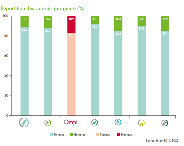 Les emplois de la branche sont en grande partie féminins : 88,9 % des salariés sont des femmes. Cette proportion est supérieure de 1,2 point à la moyenne du secteur (87,7 %).