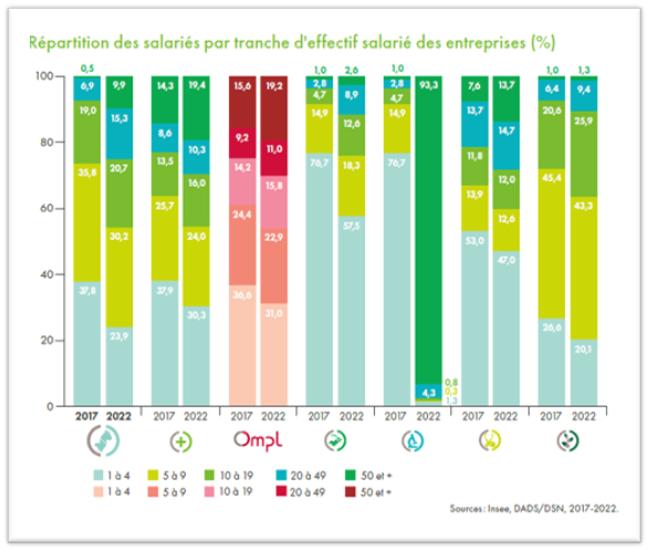 L’importance des structures à taille humaine est très marquée puisque les établissements de moins de 20 salariés regroupent 86,2 % des effectifs. Cette proportion a néanmoins reculé (– 9,1 points) par rapport à 2017.