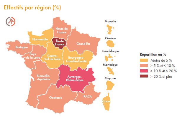 • L’Auvergne-Rhône-Alpes est la seconde région pour l’emploi de la branche (14,3 %).