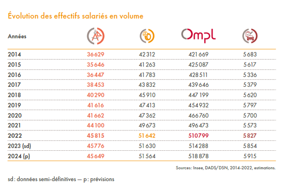 Par rapport à 2014, la branche enregistre une progression (+ 25,1 %) de ses effectifs salariés en 2022. Selon les prévisions réalisées pour les années 2023 à 2024, cette tendance semble s’infléchir à la baisse. Sur la période (2014 à 2024), les effectifs de la branche progressent plus rapidement (+ 24,6 %) que ceux du secteur (+ 21,9 %).