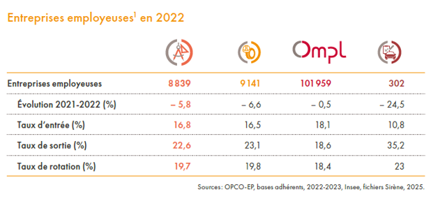 Par rapport à 2015, le stock d’entreprises de la branche a fortement augmenté (+ 89,7 %). En revanche, le stock d’établissements a peu évolué (– 1,4 %). Ces tendances indiquent l’entrée de nouvelles entreprises employeuses (par créations de structures employeuses ou embauches dans des structures initialement non employeuses). Par rapport à l’année précédente, le nombre d’entreprises de la branche a varié de – 5,8 % en 2022.