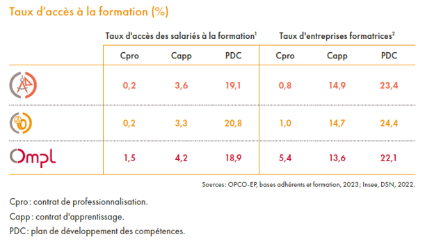 • Les entreprises de la branche ayant mobilisé au moins un des dispositifs de formation sont légèrement plus utilisatrices du contrat d’apprentissage (14,9 % contre 14,7 %) et recourent moins souvent au PDC (23,4 %) que l’ensemble du secteur (24,4 %).
