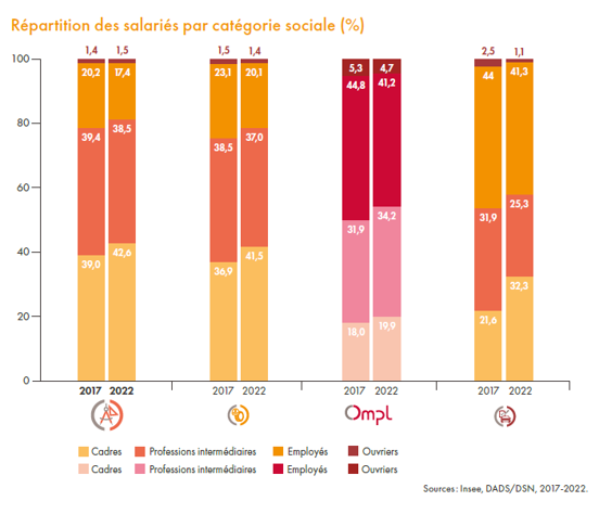 La catégorie des cadres rassemble la plus grande part des salariés de la branche (42,6 %). Avec un écart de + 4,1 points, elle est un peu plus représentée que les professions intermédiaires qui forment la deuxième catégorie la plus importante (38,5 %). Par rapport à 2017,
