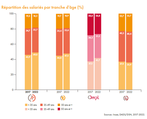 Dans la branche, la proportion de salariés de moins de 35 ans est la plus importante (49 %). La tranche des 50 ans et plus (18,2 %) est nettement moins représentée.