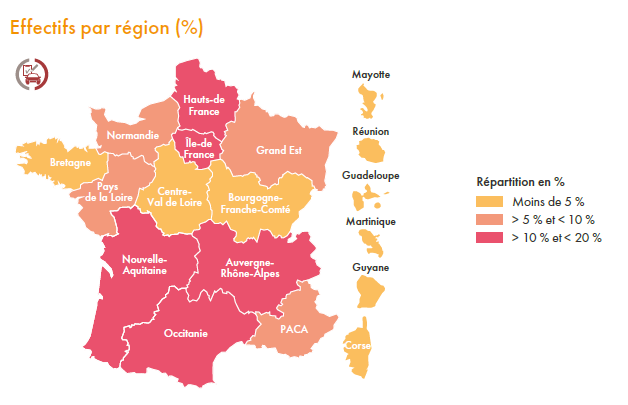 - La région Auvergne-Rhône-Alpes est la seconde région pour l’emploi de la branche (11,1 %).