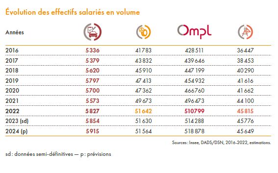 Par rapport à 2016, la branche enregistre une progression (+ 9,2 %) de ses effectifs salariés en 2022. Selon les prévisions réalisées pour les années 2023 à 2024, cette tendance semble se maintenir.