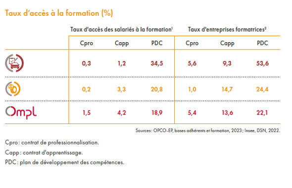 • Les entreprises de la branche ayant mobilisé au moins un des dispositifs de formation recourent plus souvent au PDC (53,6 %) que l’ensemble du secteur (24,4 %).