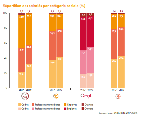 - La proportion de professions intermédiaires est moins importante (25,3%), mais elle est inférieure à la part observée pour l'ensemble du secteur (37%).