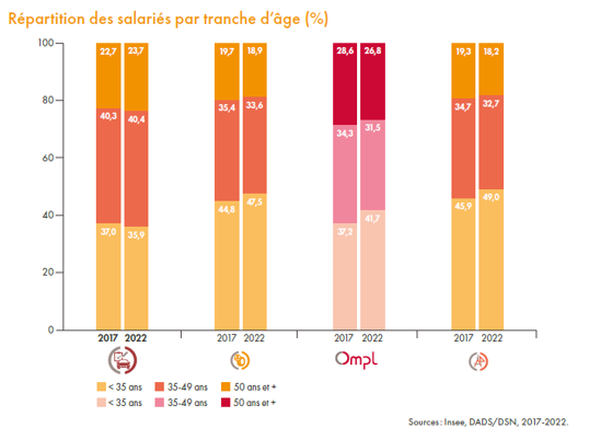 Dans la branche, la proportion de salariés de 35 à 49 ans est la plus importante (40,4 %). La tranche des 50 ans et plus (23,7 %) est nettement moins représentée.