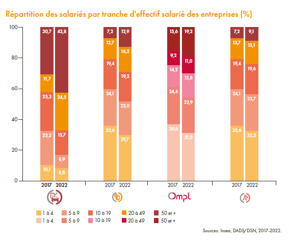 • Avec une diminution de – 8,2 points, le secteur connaît une évolution similaire mais moins marquée de la proportion de salariés employés par des petites entreprises de moins de 20 salariés.