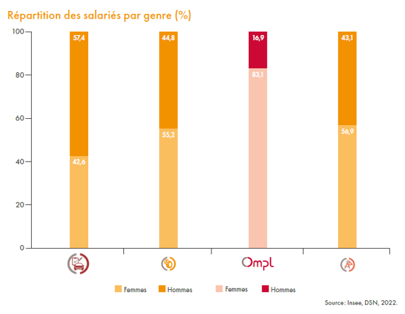 Les emplois de la branche sont principalement masculins : 57,4 % des salariés sont des hommes. Cette proportion est supérieure de 12,6 points à la moyenne du secteur (44,8 %).