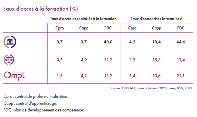 La branche est caractérisée par un réel dynamisme dans l’accès à la formation professionnelle. En effet, elle regroupe 5 % des salariés du secteur et est à l’origine de 12,5 % des actions de formation. 53,2 % des études d’administrateurs et de mandataires judiciaires se sont investies dans ces actions.