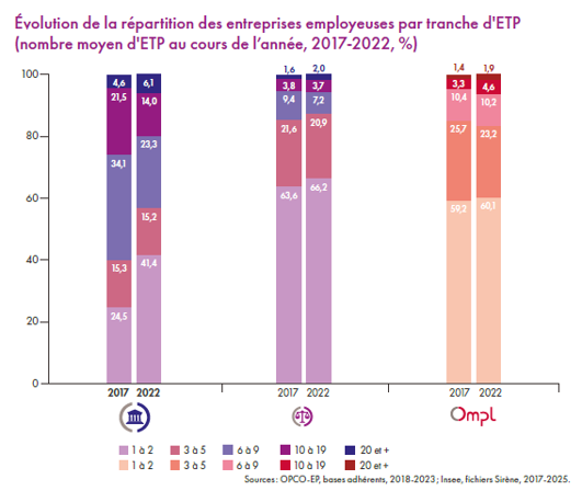 Depuis 2017, la branche est caractérisée par un renforcement de la part des entreprises d’un à deux ETP (+ 16,9 points), au détriment de celles de six à neuf ETP (– 10,8 points).