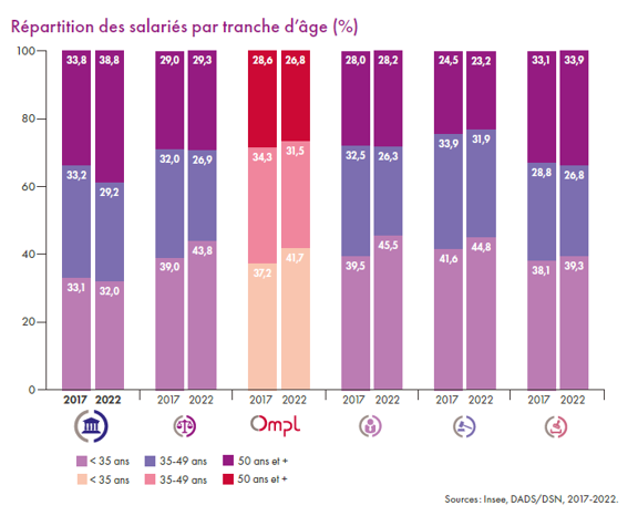 Dans la branche, la proportion de salariés de 50 ans et plus est la plus importante (38,8 %). La tranche des 35 à 49 ans (29,2 %) est nettement moins représentée. Par rapport à 2017,