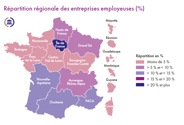 Les trois régions regroupant le plus d’entreprises employeuses sont l’Île-de-France (21,1 %), l’Occitanie (13 %) et la Provence-Alpes-Côte d’Azur (10,3%).