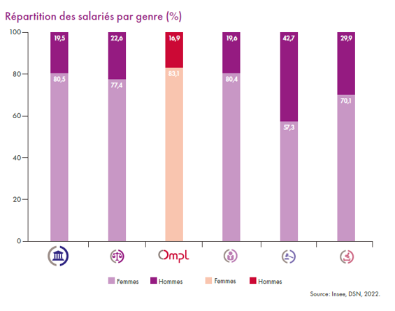 Les emplois de la branche sont en grande partie féminins : 80,5 % des salariés sont des femmes. Cette proportion est supérieure de 3,1 points à la moyenne du secteur (77,4 %).