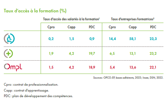 Les salariés de la branche enrichissent majoritairement leurs compétences par des formations financées dans le cadre de contrats d’apprentissage (1,5 %). Le taux d’accès à ce dispositif est inférieur à celui du secteur (– 2,7 points). Les entreprises de la branche ayant mobilisé au moins un des dispositifs de formation sont légèrement plus utilisatrices du PDC (23,3 % contre 23,2 %) et recourent plus souvent au contrat d’apprentissage (58,1 %) que l’ensemble du secteur (13,1 %).