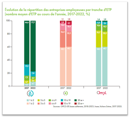 • Depuis 2017, la branche est caractérisée par un renforcement de la part des entreprises de 20 ETP et plus (+ 11,1 points), au détriment de celles de 10 à 19 ETP (– 9,5 points).