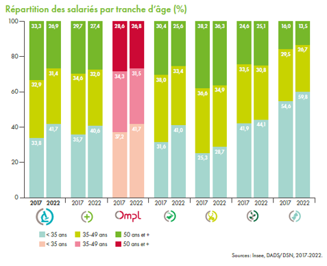 Dans la branche, la proportion de salariés de moins de 35 ans est la plus importante (41,7 %). La tranche des 50 ans et plus (26,9 %) est nettement moins représentée.