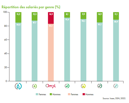 Les emplois de la branche sont en grande partie féminins : 84,8 % des salariés sont des femmes. Cette proportion est inférieure de – 2,9 points à la moyenne du secteur (87,7 %).