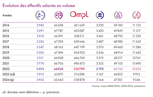 Par rapport à 2014, la branche enregistre une progression (+ 32,3 %) de ses effectifs salariés en 2022. Selon les prévisions réalisées pour les années 2023 à 2024, cette tendance semble se maintenir. Sur la période (2014 à 2024), les effectifs de la branche progressent (+ 33,7) contrairement à ceux du secteur (– 4,3 %).
