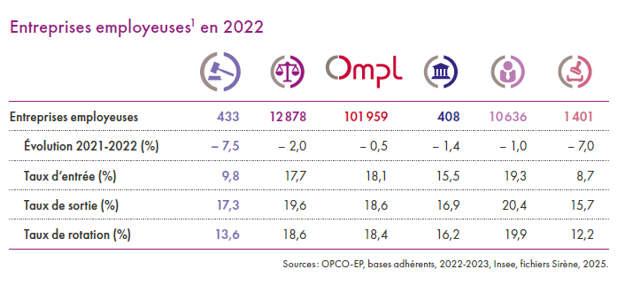 Par rapport à l’année précédente, le nombre d’entreprises de la branche a varié de – 7,5 % en 2022. La valeur plutôt moyenne du taux de rotation (13,6 % soit – 1,4 point relativement au seuil critique de 15 %) est tirée par une proportion notable de sorties (17,3 %) du périmètre de la branche.