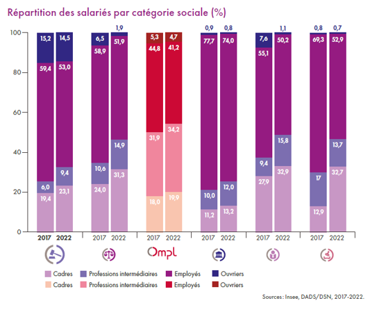 - Les cadres forment la deuxième catégorie la plus importante (23,1 %). contre 31,3 % pour le secteur.