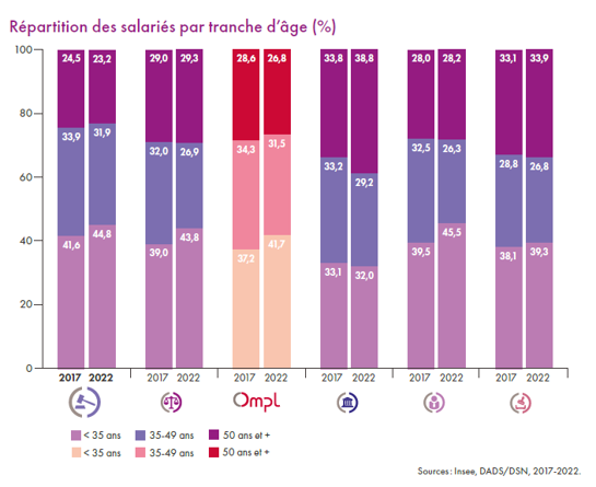 Dans la branche, la proportion de salariés de moins de 35 ans est la plus importante (44,8 %). La tranche des 50 ans et plus (23,2 %) est nettement moins représentée. Par rapport à 2017 :