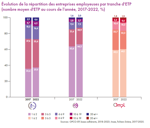 Depuis 2017, la branche est caractérisée par un renforcement de la part des entreprises de 10 à 19 ETP (+ 1,5 point), au détriment de celles de trois à cinq ETP (– 2 points). 49 % des salariés de la branche travaillent dans une entreprise de moins de 20 salariés.