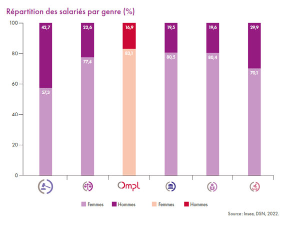 Les emplois de la branche sont principalement féminins : 57,3 % des salariés sont des femmes. Cette proportion est inférieure de – 20,1 points à la moyenne du secteur (77,4 %).