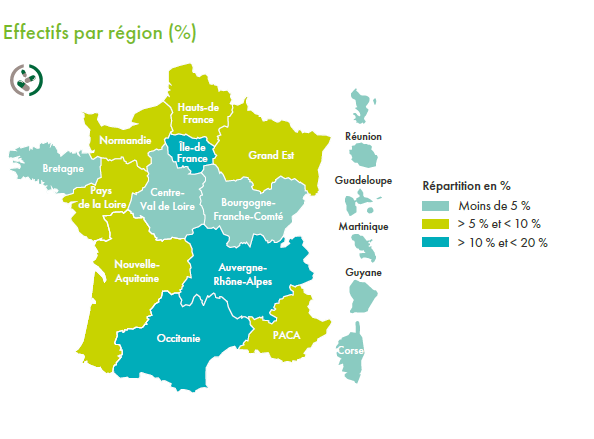 - La région Auvergne-Rhône-Alpes est la seconde région pour l’emploi de la branche (11,2 %).