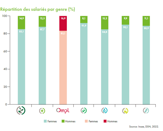 Les emplois de la branche sont en grande partie féminins : 85,1 % des salariés sont des femmes. Cette proportion est inférieure de – 2,6 points à la moyenne du secteur (87,7 %).