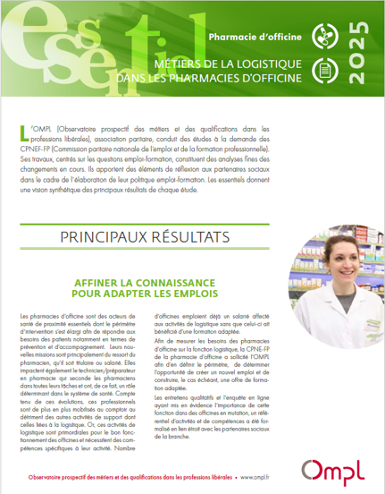 Les évolutions structurelles et organisationnelles dans les pharmacies d'officine ont conduit la CPNE-FP à solliciter l’OMPL pour la réalisation d’une étude sur les métiers de la logistique. Celle-ci, conduite en partenariat avec la CPNEFP, conclue à la pertinence de la création d’un métier de logisticien en pharmacie d’officine et d’une formation axée sur les compétences attendues pour l’exercice de ce métier.