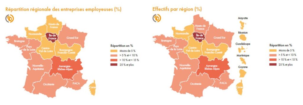 Les trois régions accueillant le plus d’entreprises employeuses sont l’Île-de-France (27.2%), l’Auvergne-Rhône-Alpes (14,7 %) et la Nouvelle Aquitaine (8,9 %).